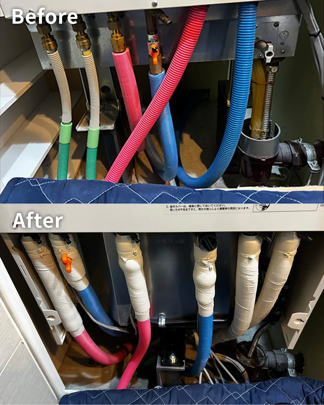 弊社では、マンションのエコキュートの配管接続部も凍結防止のため丁寧に保温・施工しております。