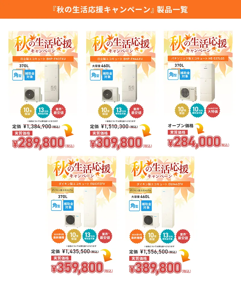 キャンペーンの対象となるのは、2025年9月発売のダイキン最新機種「Zシリーズ」の【EQX37ZFV】【EQX46ZFV】など、補助金対象エコキュート5機種。