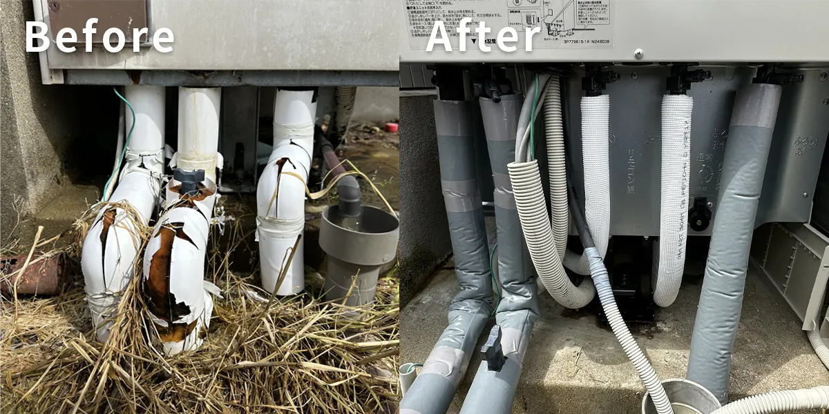 以前のカバーには亀裂が入り、中身がむき出しになっていた配管まわり。