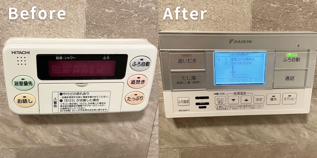 今回はマンションでの日立製の角型【BHP-TD373】からダイキン製の角型【EQX37XFV】への交換工事の事例をご紹介しました!