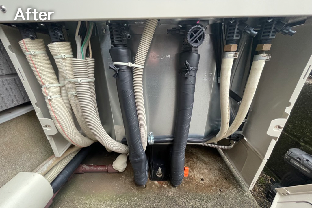 工事部材はメーカー推奨の部材、エコキュートの周辺配管やヒートポンプ配管は新品への交換をしております。