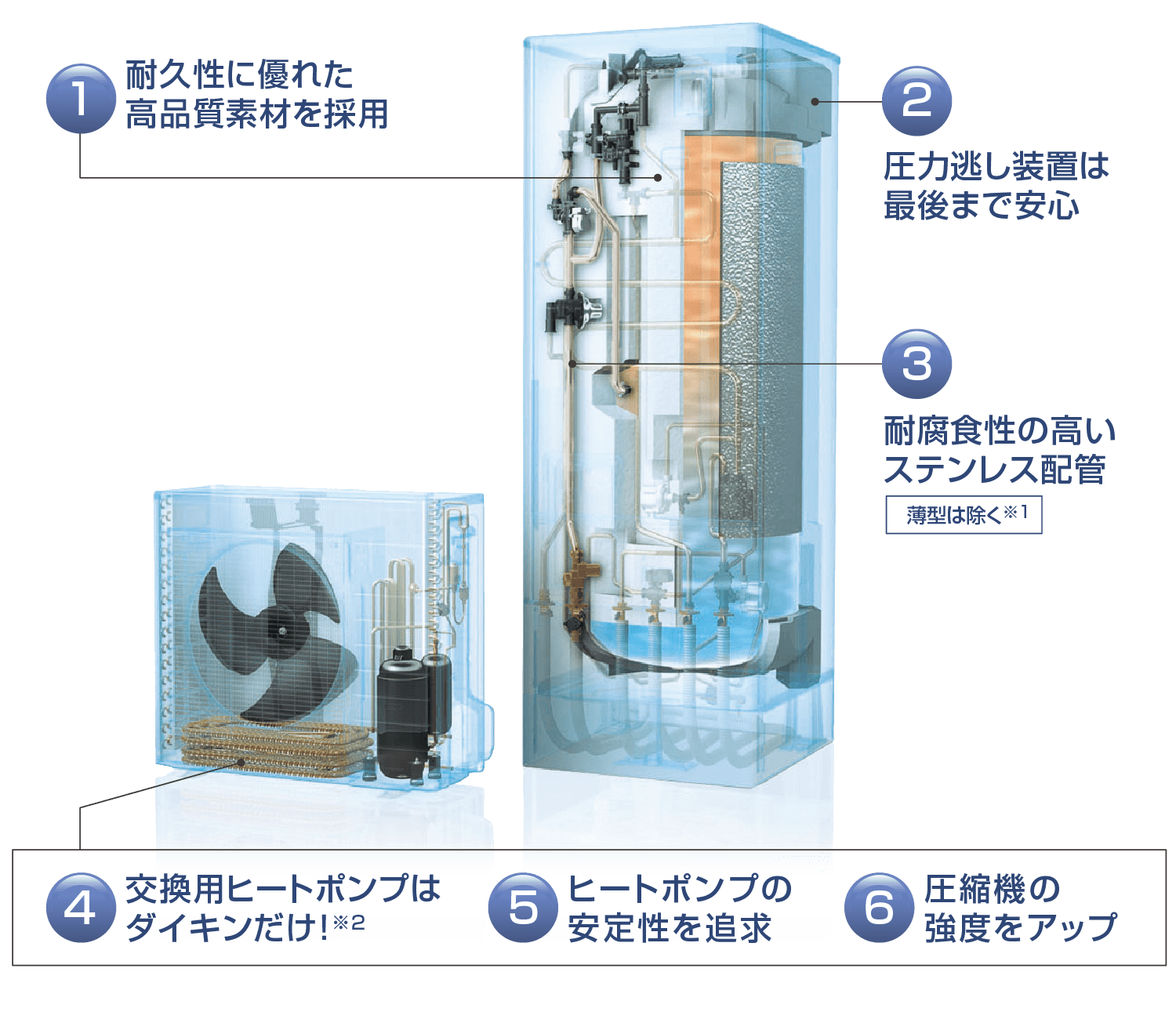 ただし、冷媒系統部分については3年間、貯湯タンクの缶本体(水漏れ現象に適用)は5年間となっています。