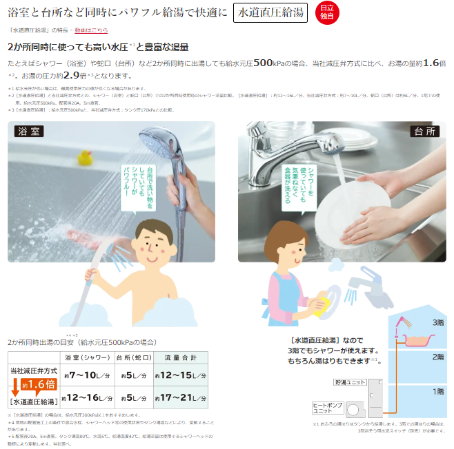 複数個所でお湯を使用することが多いご家庭やご自宅の3階に浴室がある場合にも、快適にお湯を使用できるメリットがあります。