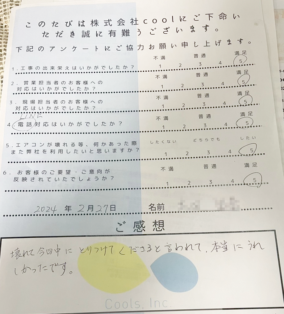 お客様アンケートでは「ALL満足」のご回答をいただき、ありがとうございました✨