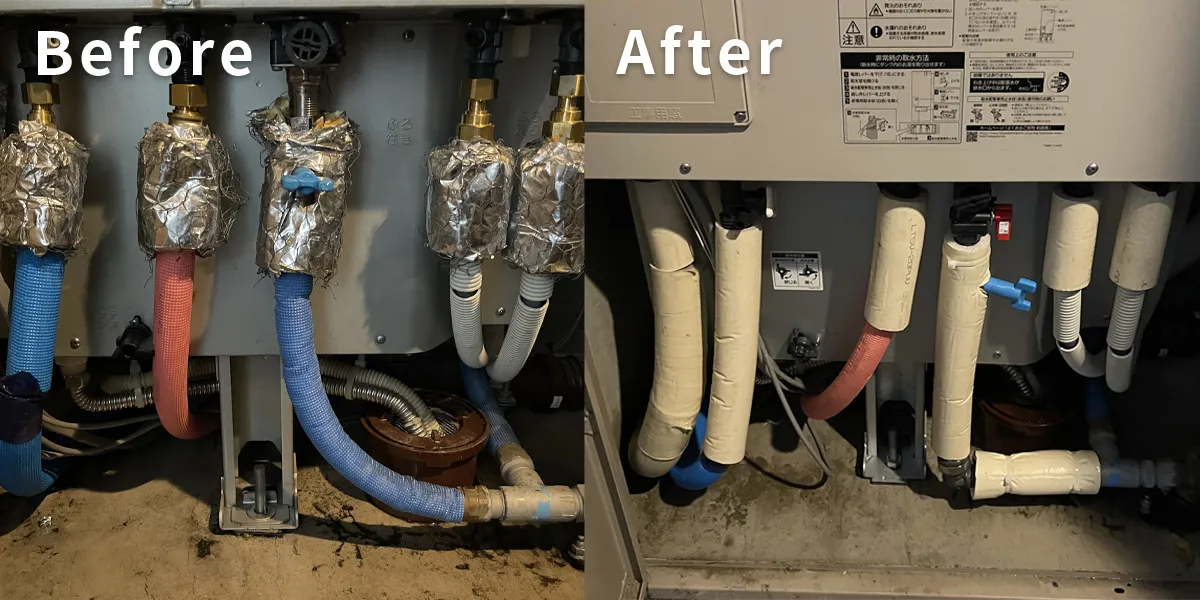 以前はアルミのようなものが巻かれ、配管のカバーとしてはちょっと心もとない印象…