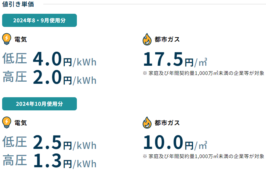 具体的には、8月・9月の使用分では4.0円/kWh、10月の使用分では2.5円/kWhの値引きが行われます。(※低圧供給・一般家庭等)
